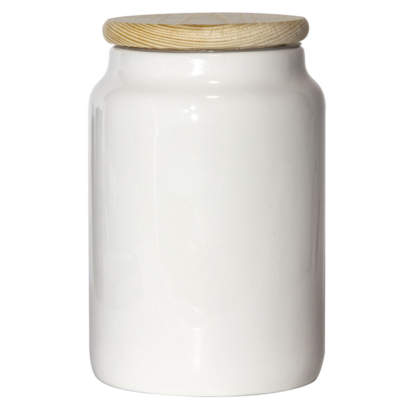 A ceramic storage jar with wooden lid that is ideal for homemade preserves or use as a coffee or sugar jar.